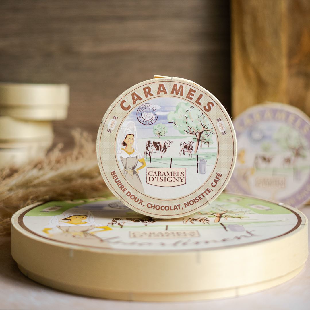 Boîte bois 150G – Assortiment “Tradition”. Vous trouverez dans cette boîte à Camembert, non pas du fromage … mais nos caramels! Découvrez notre assortiment de 4 parfums qui figurent parmi les grands classiques du caramel : caramels au Beurre doux d’Isigny A.O.P., à la noisette, au café et au chocolat.