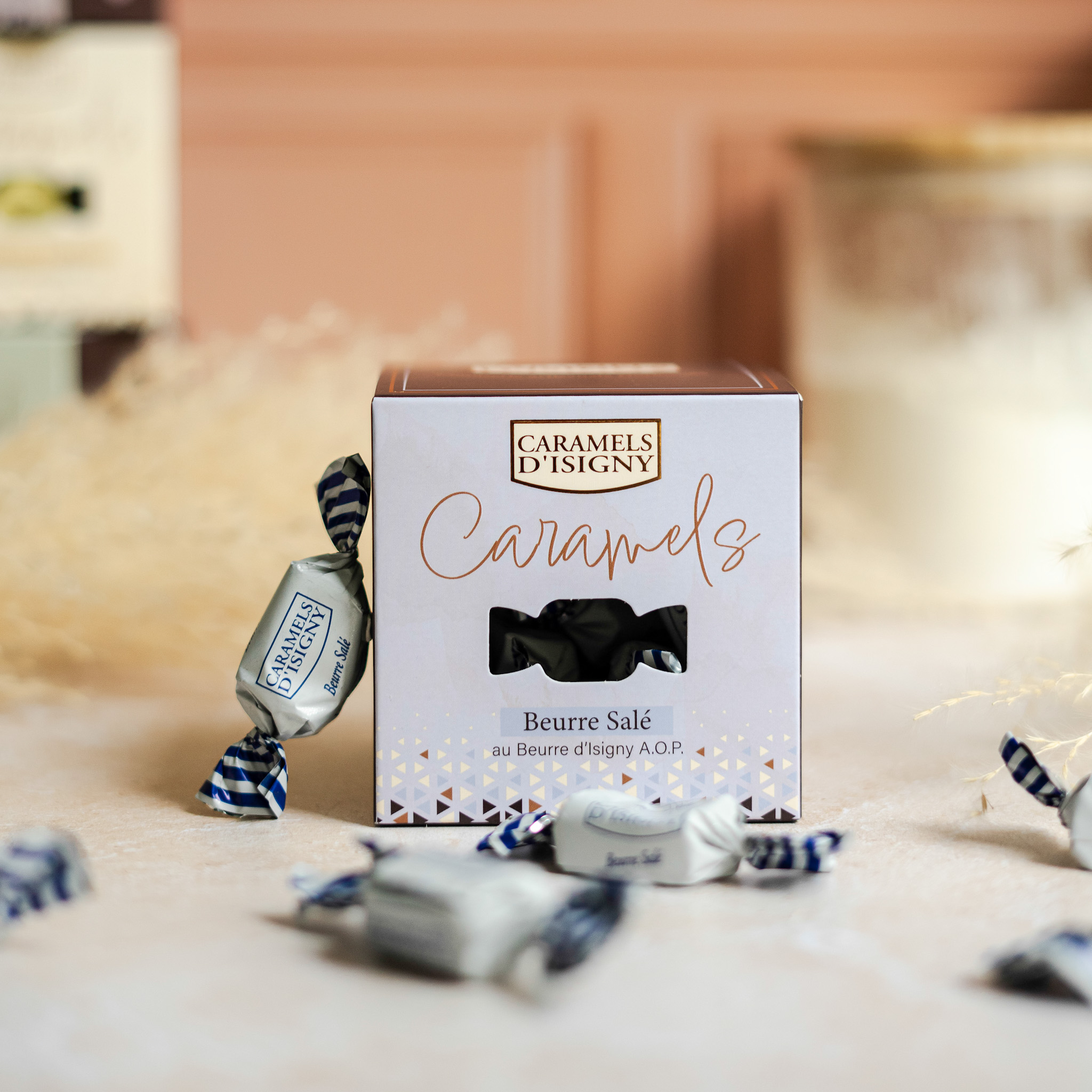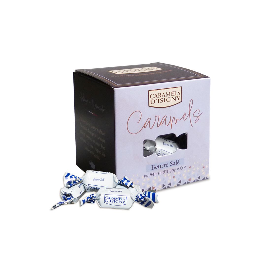 Boîte carton 100G – Caramels au beurre salé. Le caramel au beurre salé : Le grand favori des adeptes du caramel.