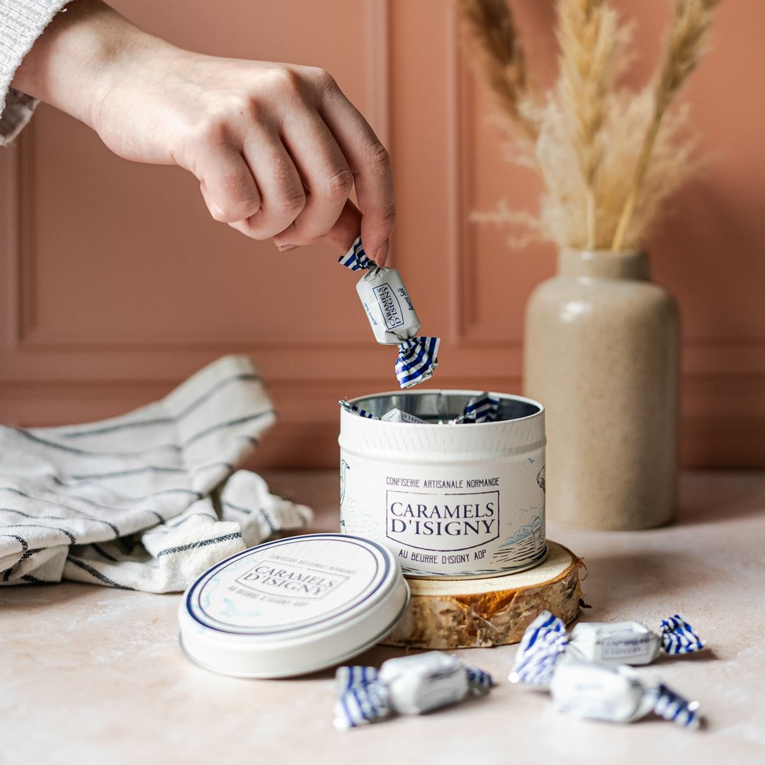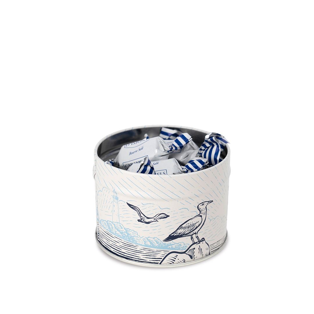 Boîte fer 100G – Découvrez notre caramel au Beurre salé, le grand favori des adeptes du caramel, dans une boîte au décor de nos côtes normandes.