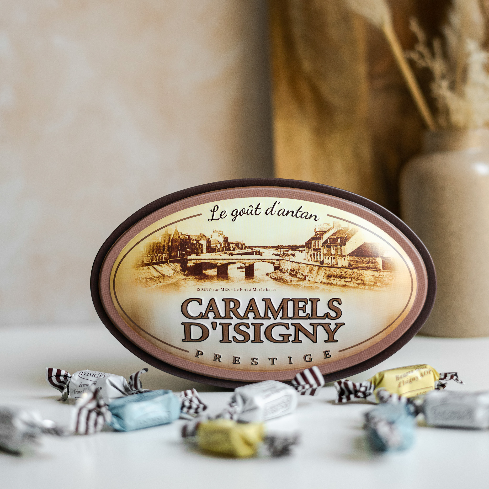 Boîte fer 250G – Découvrez notre boîte fer “Prestige” avec une sélection de 3 parfums de caramel : Beurre salé, Crème d’Isigny A.O.P. et Beurre salé/Crème d’Isigny A.O.P.