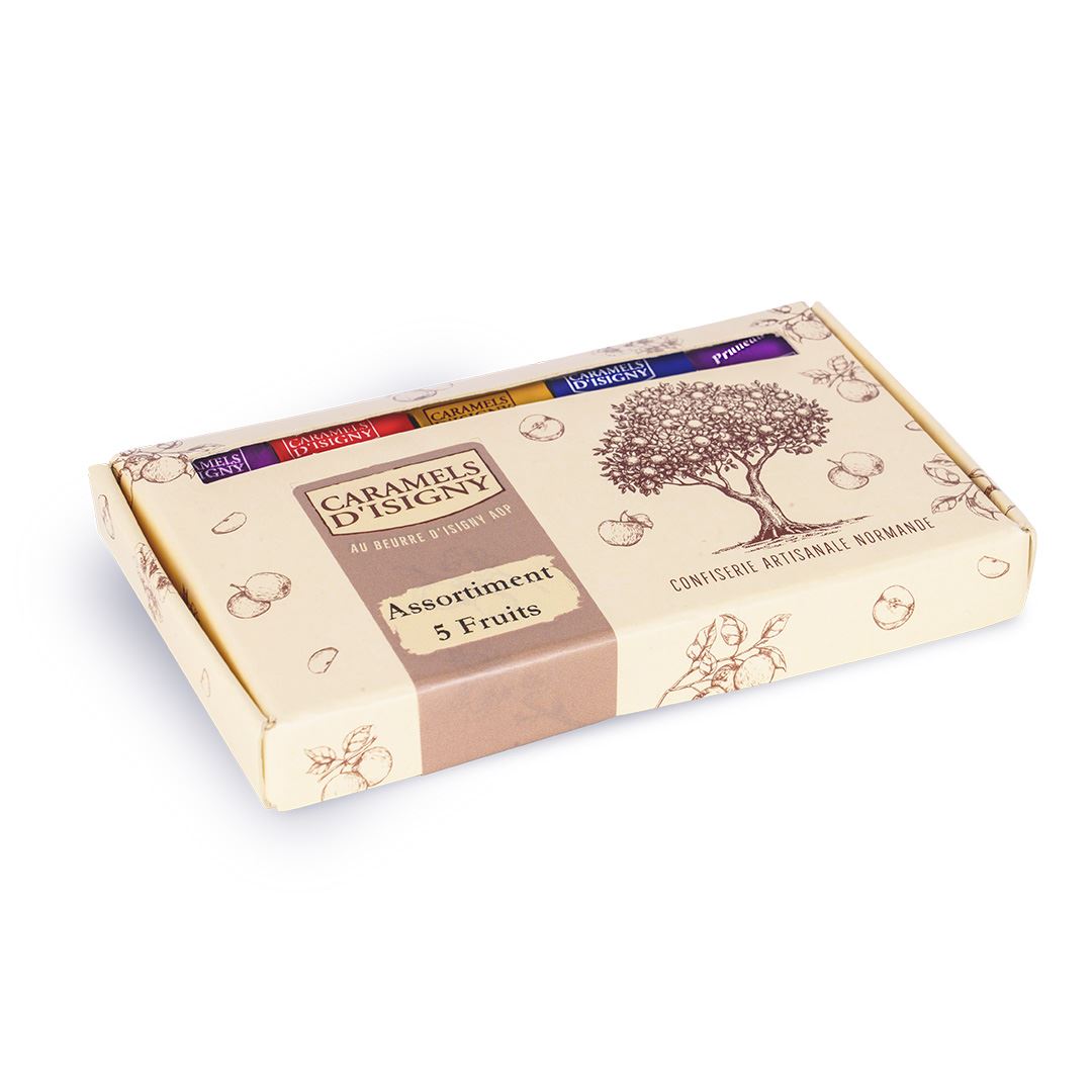 Étui carton 140G – 15 Caramels assortiment “5 fruits”. Pour les amateurs des saveurs du terroir, découvrez une sélection de 5 parfums de caramels fruités : cassis, fraise, mirabelle, myrtille et pruneau.