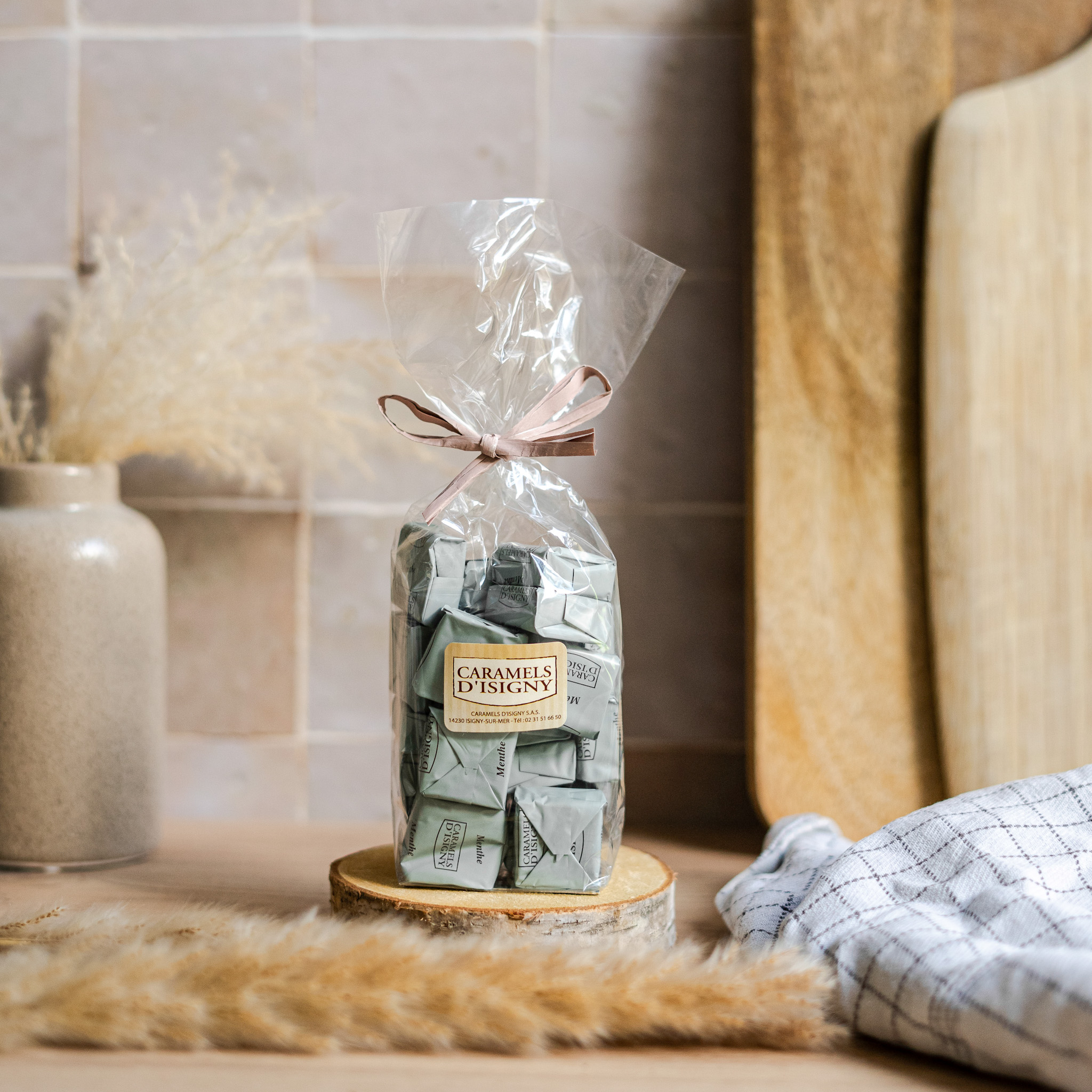 Ingrédients : Sirop de glucose, sucre, LAIT entier en poudre, BEURRE d’Isigny A.O.P., eau, arôme naturel de menthe, sel de Guérande IGP, poudre à lever : Bicarbonate de sodium, émulsifiant : Sucroesters d’acides gras. Traces : Soja, fruits à coques.