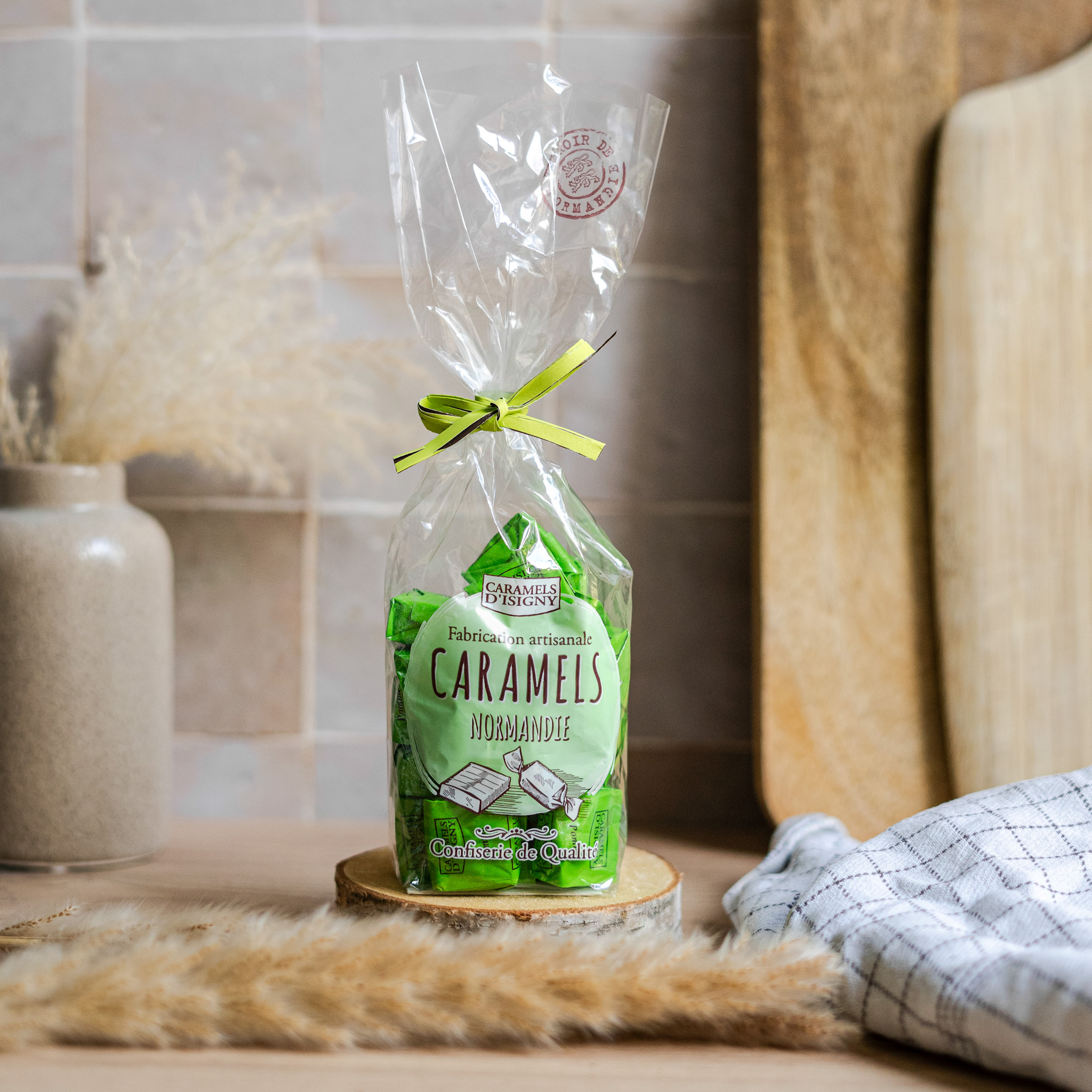 Ingrédients : Sirop de glucose, sucre, LAIT entier en poudre, BEURRE d’Isigny A.O.P., compote de pomme (pommes (4,8%), sucre), eau, arôme, sel de Guérande IGP, poudre à lever : Bicarbonate de sodium, émulsifiant : Sucroesters d’acides gras. Traces : Soja, fruits à coques.